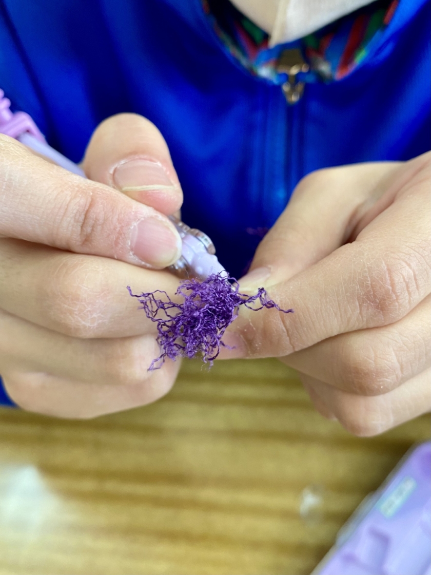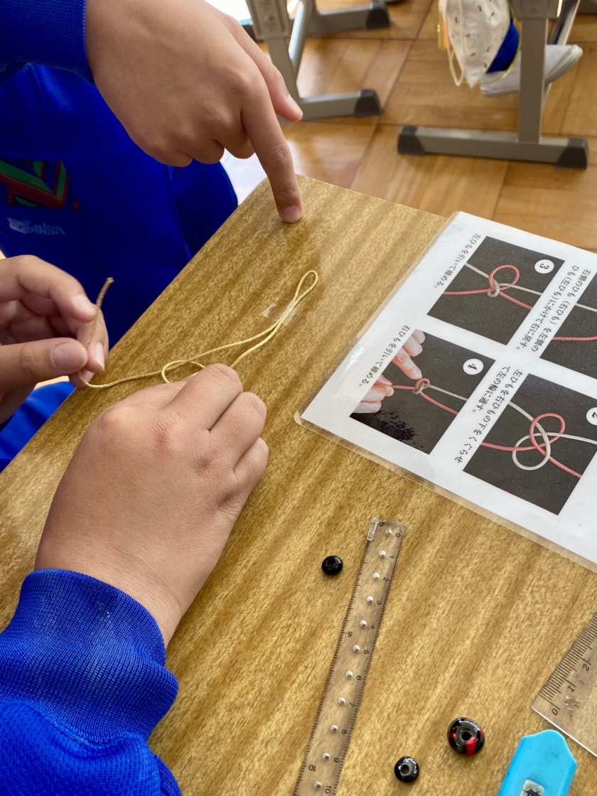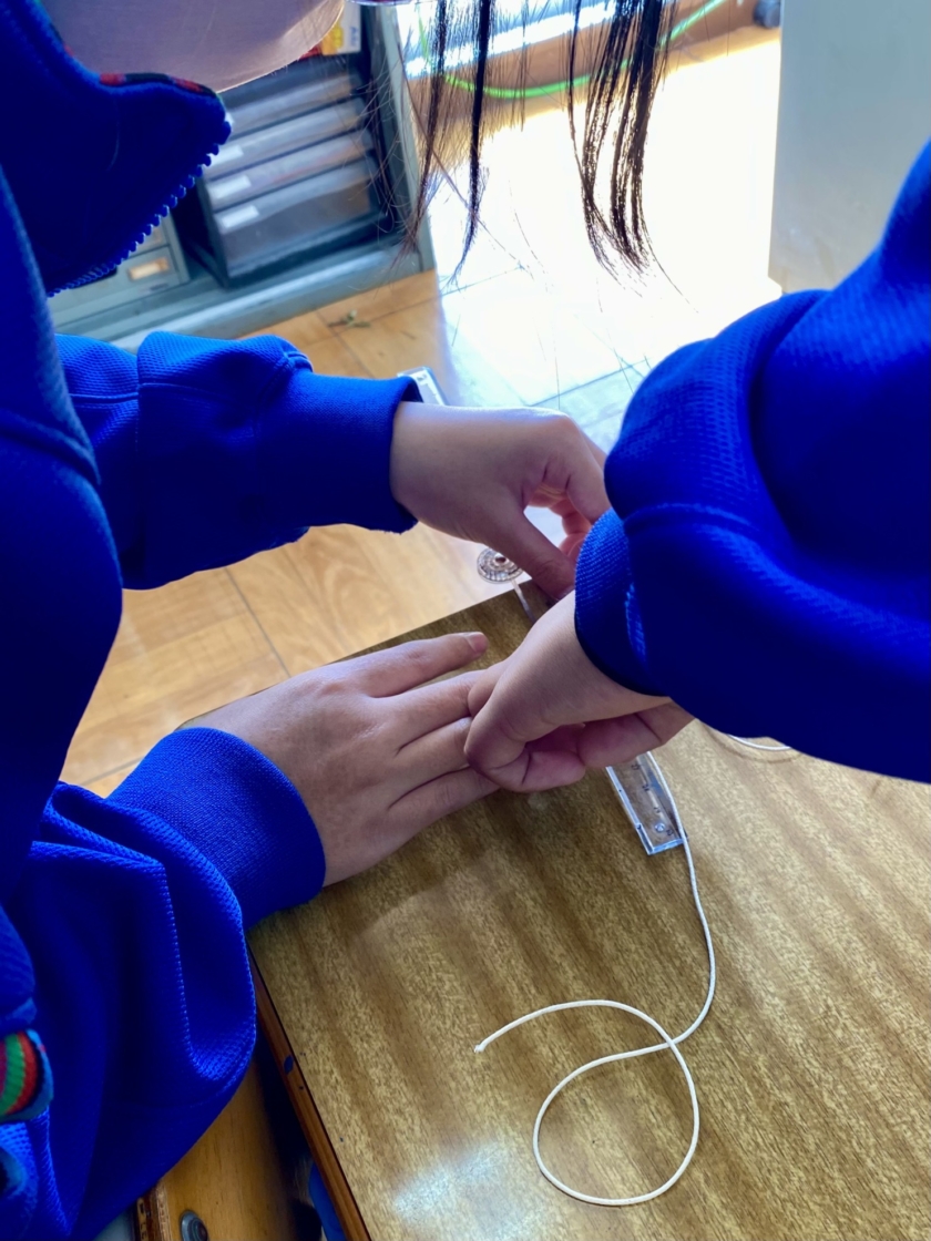 紐を40センチ測るのを筆箱の中の定規をつかったり コンパスの針で紐をほぐしたり 教室ならではの楽しいひととき