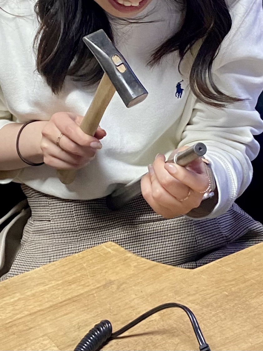 シルバーリング作り Post date 2026.03.29 Post categories In シルバーアクセサリー, ニュース, 地域情報, 工作室情報 午後からのお客さま 時間がないので輪っかからの体験でした 金槌で叩いて模様をつけます そして磨いて完成させます 楽し〜いっ! 銀の塊からのリングづくりの方がもっと楽しいですので 是非! 共有:TwitterFacebook Tags シルバーアクセサリー体験, シルバーリングづくり, 奥秩父, 秩父, 秩父体験工房 投稿ナビゲーション ←Previous post:今年も小学6年生が 卒業記念のとんぼ玉づくりに来てくれました→Next post:なみなみシルバーリング作り コメントを残す コメントをキャンセルコメント 名前 * メール * サイト 次回のコメントで使用するためブラウザーに自分の名前、メールアドレス、サイトを保存する。