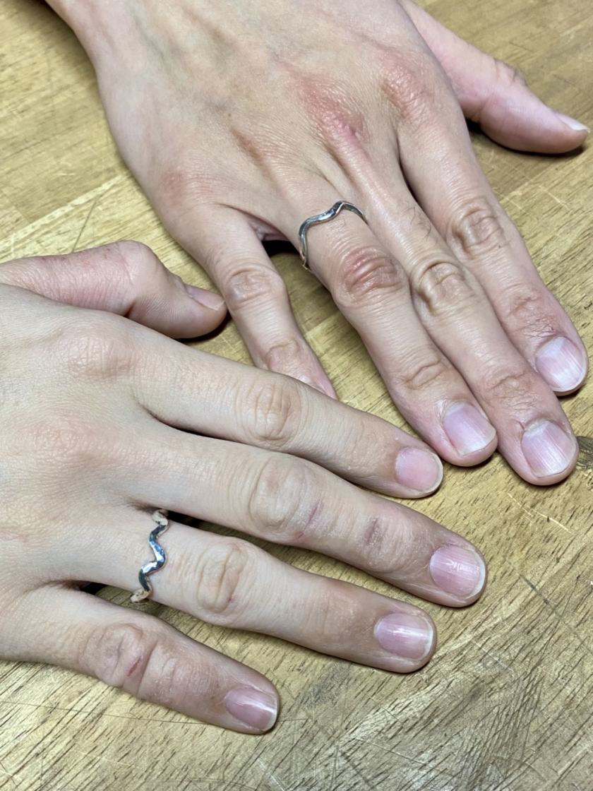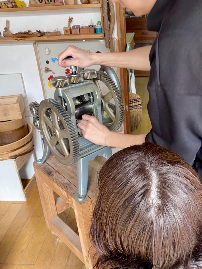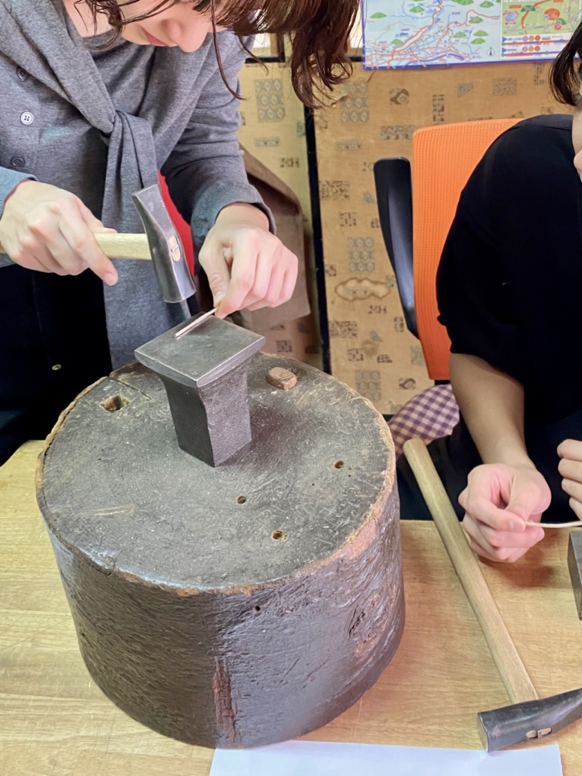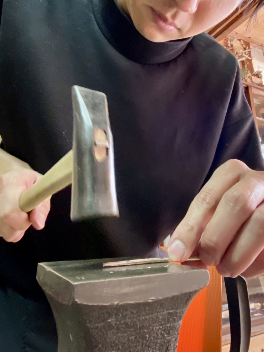 材料どり 銀の塊を叩いて棒にしてローラーで延ばして細くしていきます
