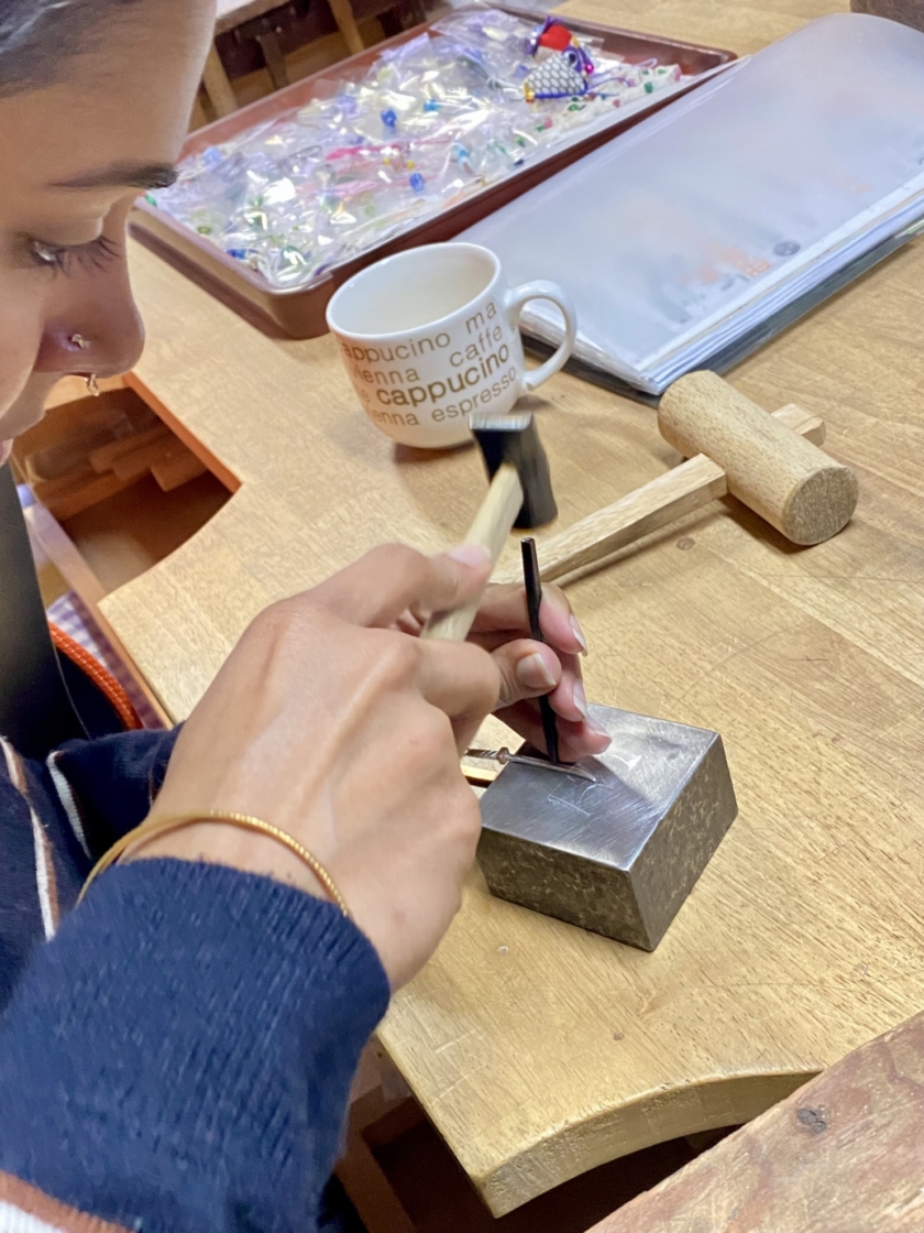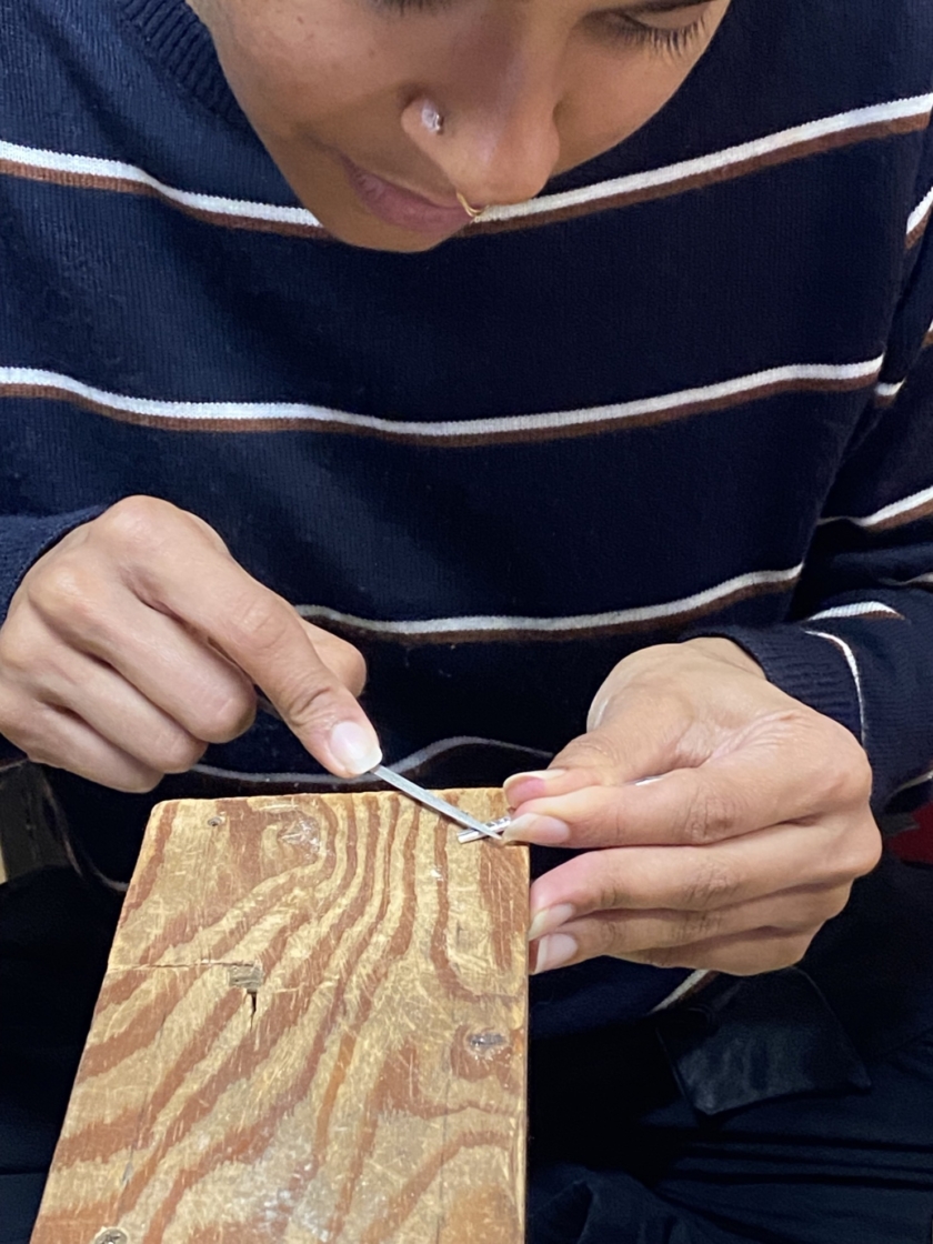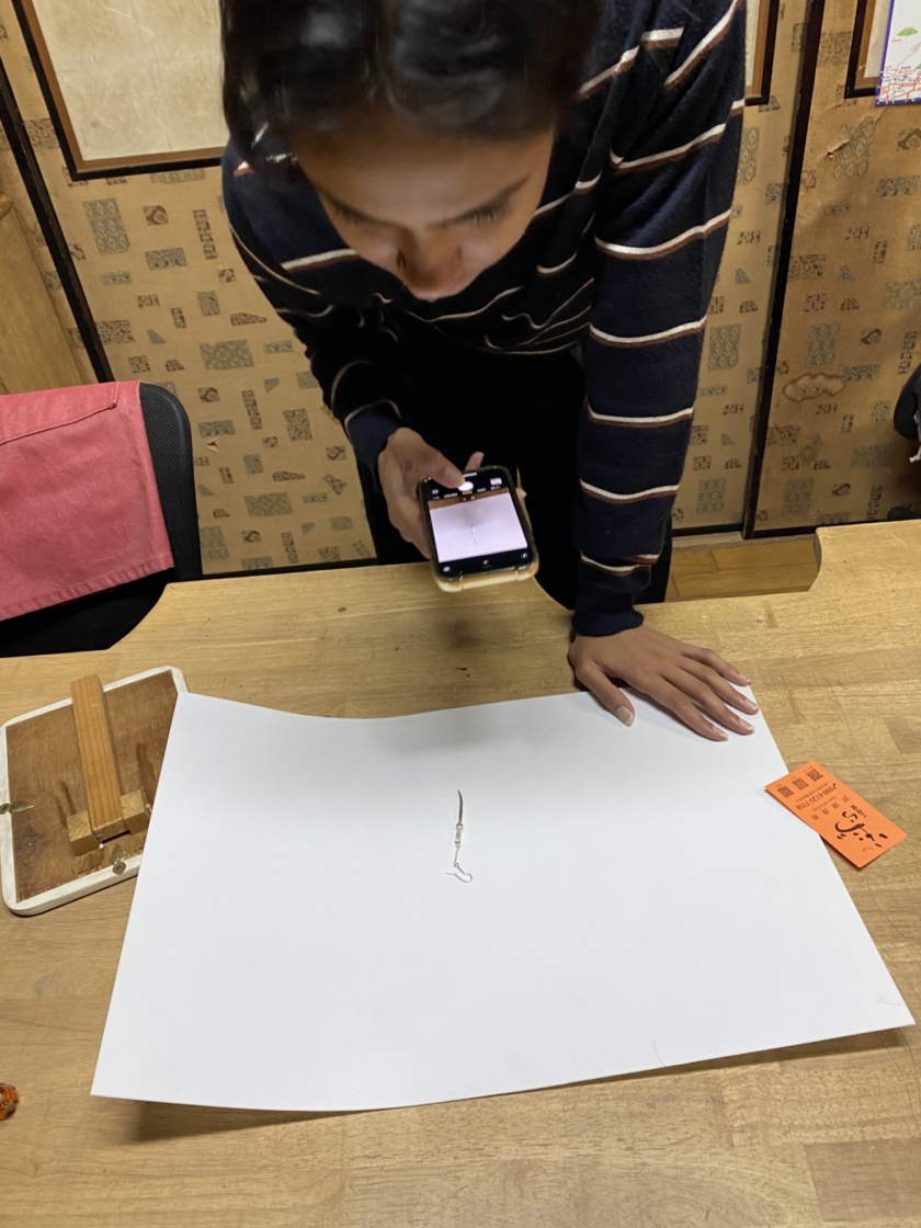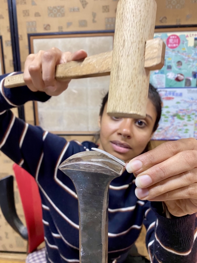 刀のピアスづくり Post date 2026.04.07 Post categories In シルバーアクセサリー, 工作室情報, 彫金 カタコトの英語 カタコトの日本語 身振り手振り 初めてのヤスリがけ 思うようにいきません サイズ感を方眼紙で確認しながら 鍔は銅にしました こんなに小さいのにこだわりの「樋」を入れて 反り加減の調整 最後の磨き お気に入りが出来上がって良かったですね 共有:TwitterFacebook Tags シルバーピアス, シルバーピアスづくり, 刀, 奥秩父, 秩父, 秩父体験工房 投稿ナビゲーション ←Previous post:春休み とんぼ玉づくり コメントを残す コメントをキャンセルコメント 名前 * メール * サイト 次回のコメントで使用するためブラウザーに自分の名前、メールアドレス、サイトを保存する。